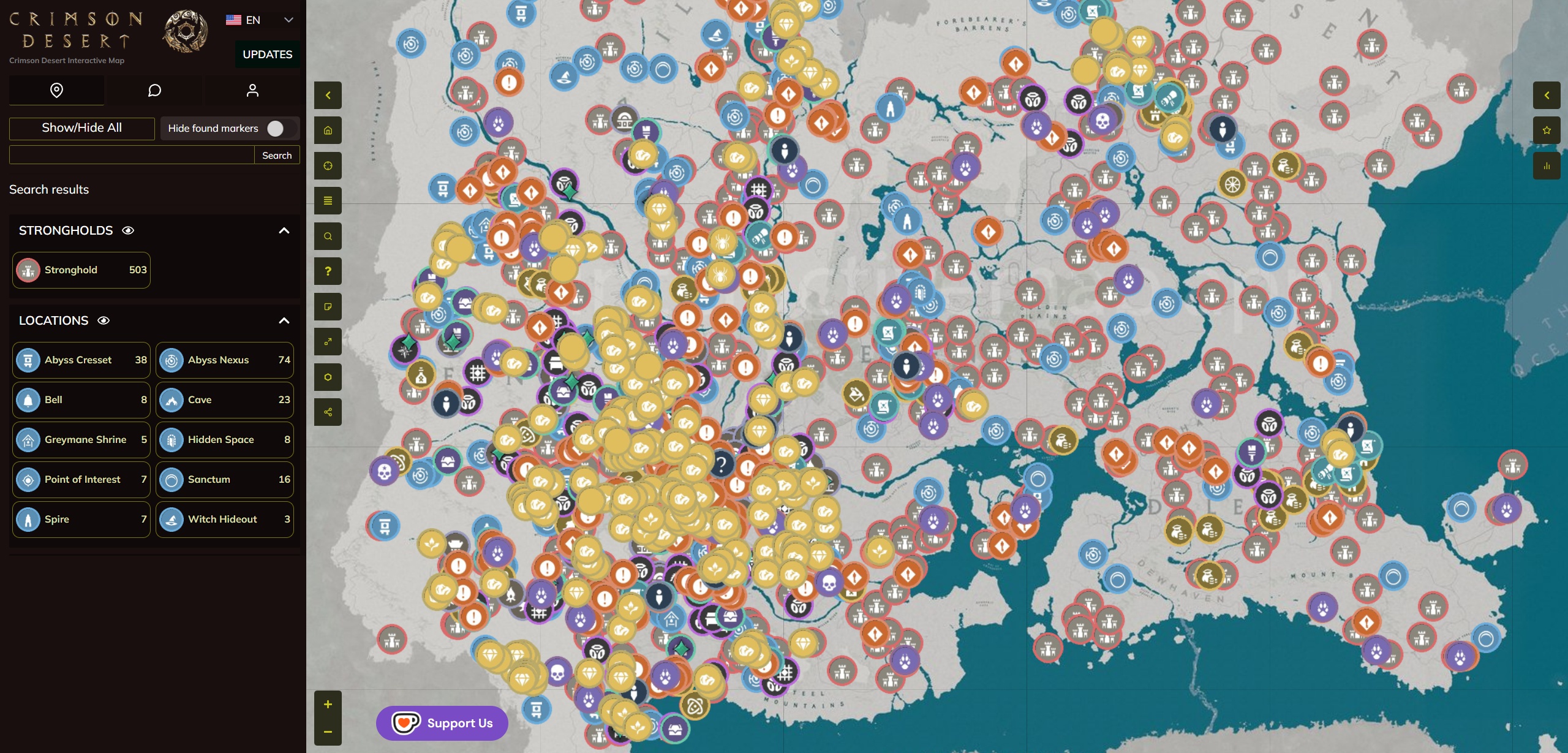 Bienvenido al Mapa Interactivo de Crimson Desert más completo, diseñado para ayudar a los mercenarios a explorar cada rincón del vasto mundo de Pywel.Ya sea que estés cazando Jefes de Mundo, completando las misiones de facción, recolectando minerales raros o buscando cofres ocultos, esta herramienta es indispensable para planificar tu aventura.https://crimson-desert.interactivemap.app/